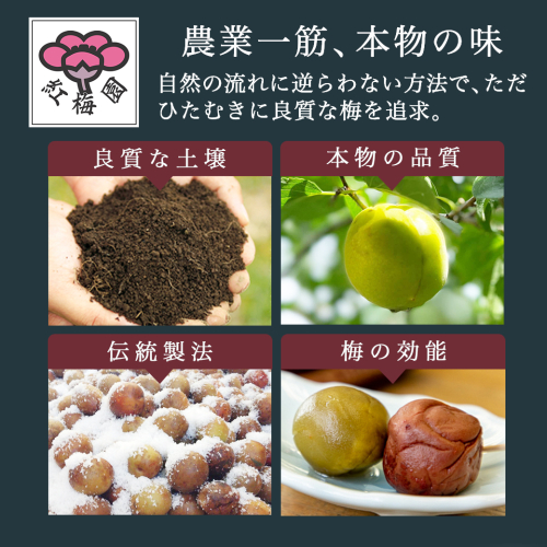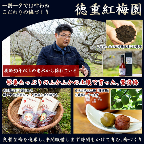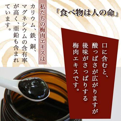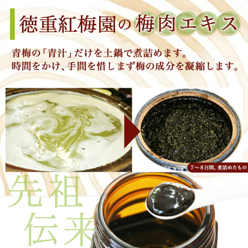 栽培期間中、農薬を使わずに自家生産した「鶯宿梅」の果汁だけを土鍋で7~8日間、煮詰めたエキスです。 「土は命 食べ物は人の命」 土づくりからこだわり、栽培期間中農薬を使わずに自家栽培した在来品種「鶯宿梅(おうしゅくばい)」の青梅の青汁だけを土鍋で7~8日間、じっくりと時間をかけ、手間暇を惜しまず煮詰めた「梅のエキス」です。 ばあちゃんが祖父より手を取って教えられた作り方と「2日よりも3日、3日よりも4日、煮詰めれば煮詰めるほど良い物が出来る。」という言葉をしっかりと守り、じっくり時間と手間を惜しまずに煮詰めたエキスは、傾けてもこぼれないほどの粘度です。 カリウム、鉄、銅、マグネシウムの含有量が高く、亜鉛も含まれています。 口に含むと、酸っぱさが広がりますが、後味がさっぱりする梅肉エキスです。 【提供事業者】(有)徳重紅梅園
