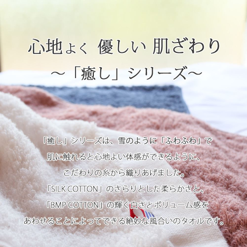SILK COTTONのさらりとした柔らかさと、BMP COTTONの輝く白さとボリューム感をあわせることによってできる絶妙な風合い。これによって、本タオルの肌触りは、「癒し」がうまれます。日常に、ちょっとした贅沢をもたらしてくれる、そんなタオルを作りました。