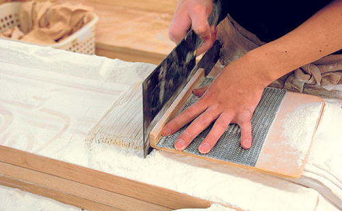 国産の蕎麦の実を、石臼でじっくり時間を掛けて挽いたそば粉を職人が丹精込めて手作業で打っています。