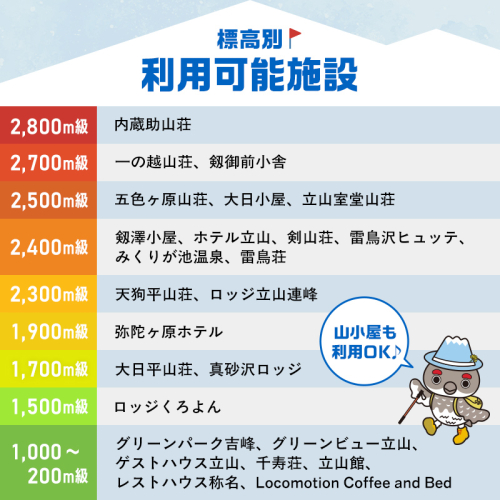 グリーンパーク吉峰、グリーンビュー立山、ゲストハウス立山(要予約)、千寿荘、立山館、レストハウス称名、Locomotion Coffee and Bed