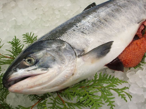 網走沖で水揚げされた秋鮭(メス)をすばやく捌いて筋子を取り出しています。