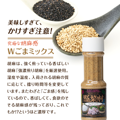 「野菜嫌いなお子様にもピッタリ!」のキャッチフレーズで浜松の皆様にはお馴染みの創業1977年のドレッシング専業メーカーが作る「野菜村ドレッシング」。中でも『Wごまミックス』は、発売以来全国各地のお客様からお取り寄せのお電話をいただく人気商品です。お豆腐やしゃぶしゃぶにもピッタリで、わざと強く焙煎しているごまを触感を絶妙に触感を残し、胡麻感をたっぷり出した甘口になっています。