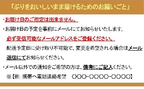その場合は、「氷見漁港で競られた天然鰤」の送付もしくは次年度(2026年度)のお届けにて対応させていただきます。