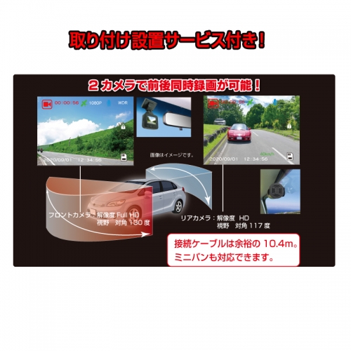 【付属品】フロントカメラ取付ステー、シガー電源コード、両面テープ、リアカメラ(コード長約0.5m)、リアカメラ接続ケーブル(約9.9m)、MICROSDカード(8GB)、取扱説明書、注意喚起ステッカー
