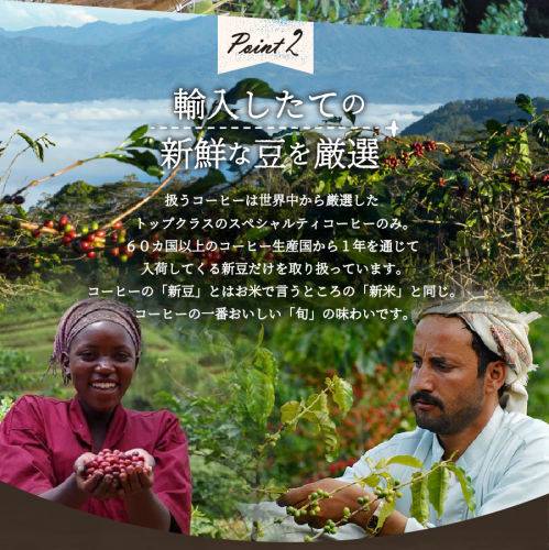 60カ国以上のコーヒー生産国から1年を通じて入荷してくる新豆だけを取り扱っています。
