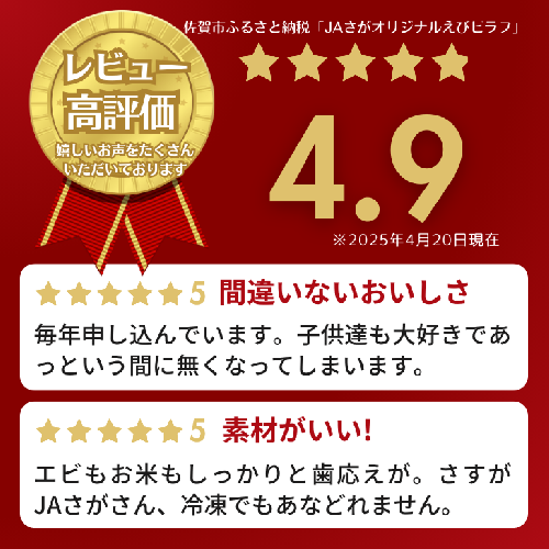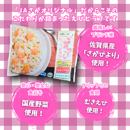 美味しくてスーパーで冷凍ピラフを買う気を無くすぐらいです。エビは大きくプリプリ、お米もしっかりした食感があり、素材を活かしたアッサリ味で何杯も食べられます。忙しい時の常備食のつもりでしたが、家族の奪い合いですぐ無くなり、2回目リピートしました。JAさがさんの食へのこだわりを感じました。他にも美味しい食材がありそうだと佐賀に興味が沸きました。