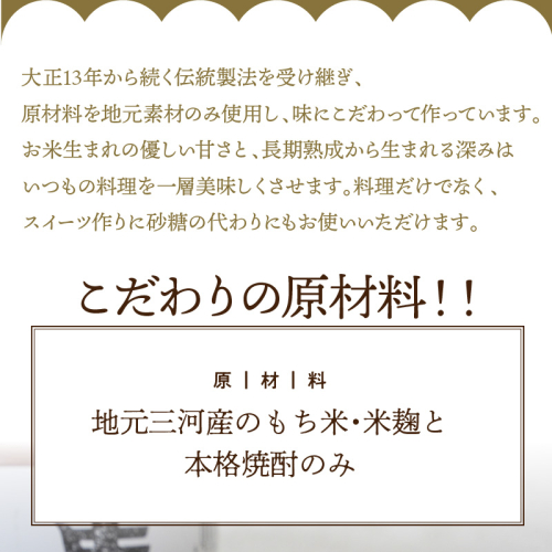 大正13年から続く伝統製法を受け継ぎ、原材料を地元素材のみ使用し、味にこだわって作っています。お米生まれの優しい甘さと、長期熟成から生まれる深みはいつもの料理を一層美味しくさせます。料理だけでなく、スイーツ作りに砂糖の代わりにもお使いいただけます。