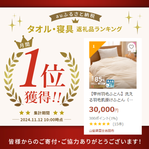 - 【甲州羽毛ふとん】洗える羽毛肌掛けふとん(シングル)
