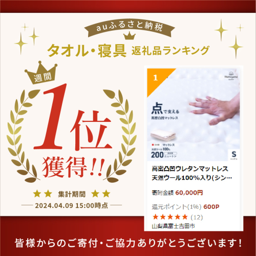 高密凸凹ウレタンマットレス 天然ウール100%入り(シングル)