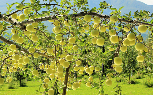 「サンふじ」は、果実に袋をかけない栽培方法で、太陽を直接受け、甘味が強くジューシー。「王林」は、甘味が強く、独特の甘い芳香があります。