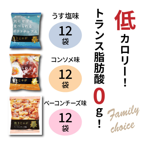 特許技術の遠赤外線加工で抜群のサクサク感が楽しめるノンフライ製法のポテトチップス「焼きじゃが」。本商品は、育ち盛りのお子様のおやつとしておススメする人気の3つの味「うすしお味」、「コンソメ味」、「ベーコンチーズ味」を何と各12袋(計36袋)お届けします!カロリーも少なく、しかもトランス脂肪酸フリー(0g)です。ふるさと納税でもリピートの多い人気商品、全国のスナック菓子ファンの皆さんに超おススメです!