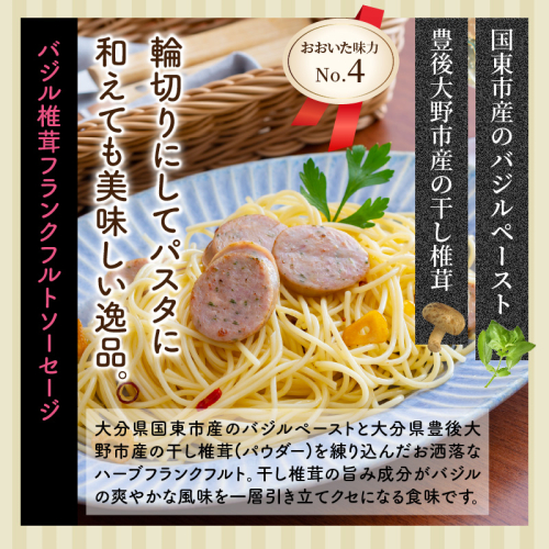 ・バジル椎茸フランクフルトソーセージ=大分県国東市産のバジルペーストと大分県豊後大野市産の干し椎茸(パウダー)を練り込んだお洒落なハーブフランクフルト。干し椎茸の旨み成分がバジルの爽やかな風味を一層引き立てクセになる食味です。輪切りにしてパスタなどに和えても美味しくお召し上がりいただけます。