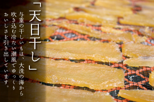 与重の干しいもは、大洗の海から吹き込む冷たい潮風でゆっくりおいしさを引き出す、「天日干し」にこだわっています。