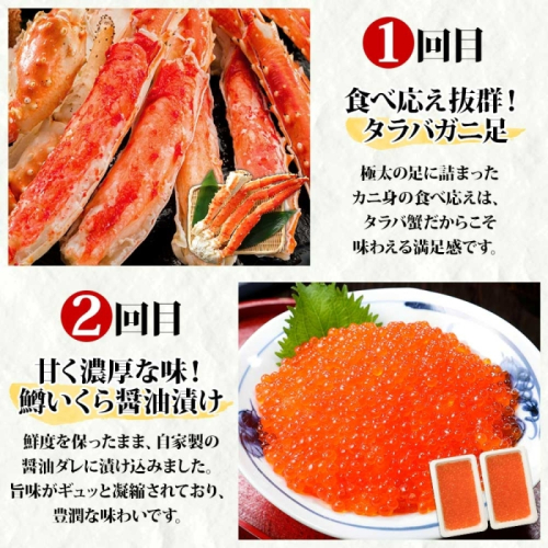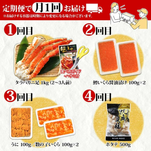 ■定期便■ 1583.蟹 海鮮 頒布会 全4回 タラバガニ足 1kg 鱒いくら 醤油漬け 200g 数の子いくら醤油漬け 200g & ウニ チリ産 冷凍 雲丹 うに 100g ホタテ 500g 蟹 カニ かに 海鮮 送料無料 北海道 弟子屈町