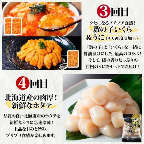 - ■定期便■ 1583.蟹 海鮮 頒布会 全4回 タラバガニ足 1kg 鱒いくら 醤油漬け 200g 数の子いくら醤油漬け 200g & ウニ チリ産 冷凍 雲丹 うに 100g ホタテ 500g 蟹 カニ かに 海鮮 送料無料 北海道 弟子屈町