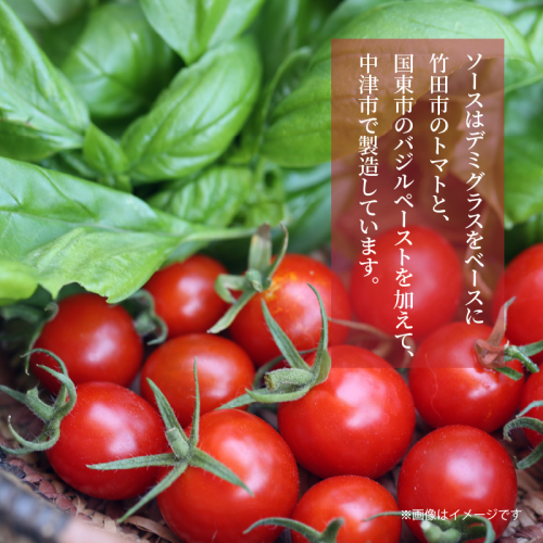 さらにお肉の味を引き出すため、杵築市の1番茶を粉末にして練りこみ、ソースはデミグラスをベースに竹田市のトマトと、国東市のバジルペーストを加えて、中津市で製造しています。
