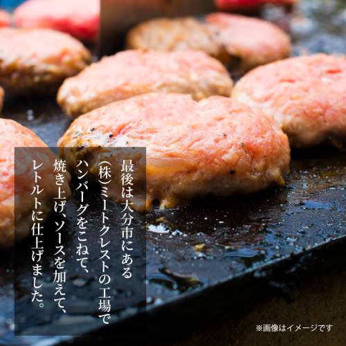 大分県8つの自治体でキラリと輝く地域資源を厳選した最高のハンバーグがついに完成。 最高の合い挽き肉を求めて、豊後高田市の牛肉と、日出町の豚肉を7:3で合わせました。お肉を練るためのお塩には佐伯市の海水を釜で炊き上げたものを使用。 さらにお肉の味を引き出すため、杵築市の1番茶を粉末にして練りこみ、ソースはデミグラスをベースに竹田市のトマトと、国東市のバジルペーストを加えて、中津市で製造しています。 最後は大分市にある(株)ミートクレストの工場でハンバーグをこねて、焼き上げ、ソースを加えて、レトルトで仕上げていますのでレンジの上にお皿を載せて、文字が書いてある方を上にして500wで6分間。あっというまに自宅がレストランになるような楽しさが味わえます。お弁当に入れたら、いつもと違う美味しさに驚かれること間違いなし。