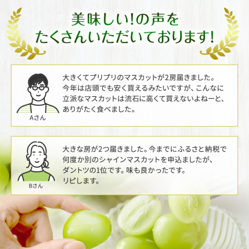 超お買い得です。スーパーで購入するものとは比較にならない味、見た目、クオリティやはり本場のシャインスカットは一味も二味も違うなと感じました。またリピートさせていただきます!