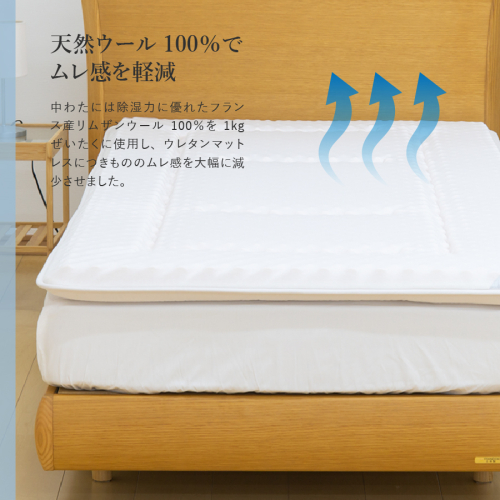 中わたには除湿力に優れたフランス産リムザンウール100%を1kgぜいたくに使用し、ウレタンマットレスにつきもののムレ感を大幅に減少させました。