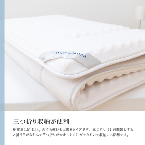 製品の厚みは約7.5cm(ウレタン層5cm+ウール層2.5cm)で総重量は約3.4kg(当社従来品より約19%の軽量化)の持ち運びも出来るタイプです。