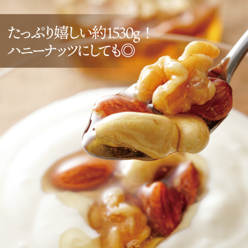 無塩の素焼きミックスナッツがたっぷり1,530g入っています。