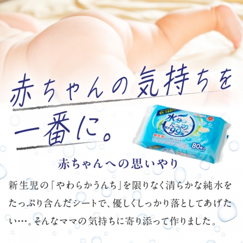 【生まれたてのデリケートなお肌に】 新生児の「やわらかうんち」を限りなく清らかな純水をたっぷり含んだシートで優しくしっかり落としてあげたい・・・というママの気持ちで作りました。赤ちゃんも使える化粧水の品質で仕上げたおしりふきです。