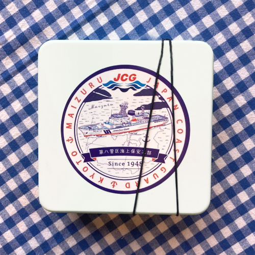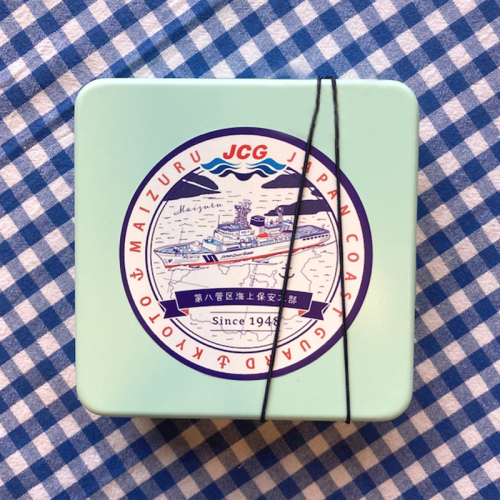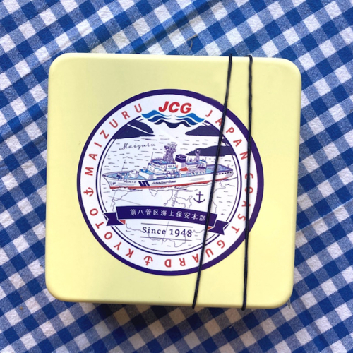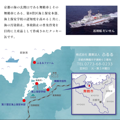 第8管区海上保安本部が舞鶴市との共同企画で、海の汚染防止、事故防止の普及啓発と京都の海の玄関口である舞鶴市とその舞鶴市にある、第8管区海上保安本部、海上保安学校の認知度を高めることを目的に、土産品として作成されたクッキー缶です。