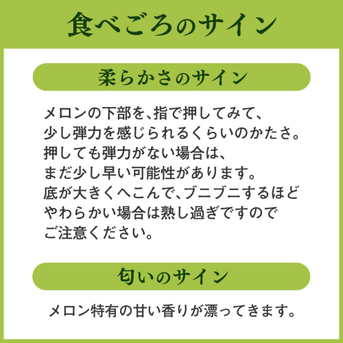 【柔らかさ】メロンのお尻、下部のところを、親指で押してみて、少し弾力を感じられるくらいのかたさ。押しても反応がない場合は、まだ少し早い可能性があります。底が大きくへこんで、ブニブニするほどやわらかい場合は熟し過ぎです。