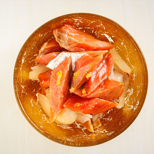 白鮭(北海道産)、玉ねぎ、リンゴ酢、砂糖、食塩、還元水飴、水あめ、レモン果汁、グレープシードオイル、米発酵調味料、ゆず皮、ローリエ、唐辛子、胡椒/ソルビトール、調味料(アミノ酸等)、酒精、酸味料、酸化防止剤(V.C)、着色料(紅麹)