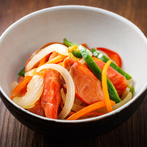 美味しいと評判の釧之助の鮭とばをピクルス風のお酢に漬け込むと…さらに美味しくなりました!お酒のアテはもちろん、お料理のちょっとしたアクセントにもぴったりです。