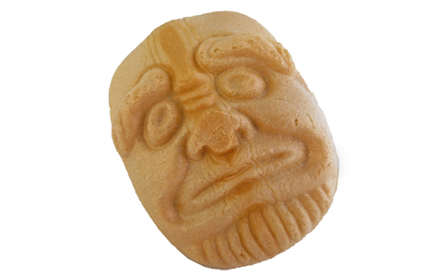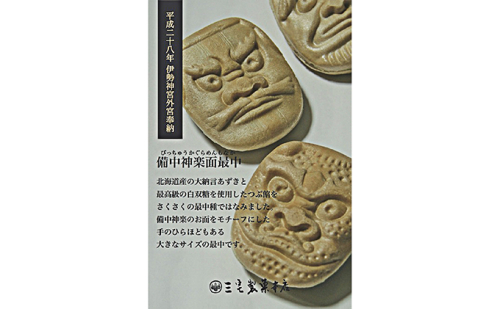国の重要無形民俗文化財「備中神楽」の神々のお面をモチーフにした粒あんの最中です。