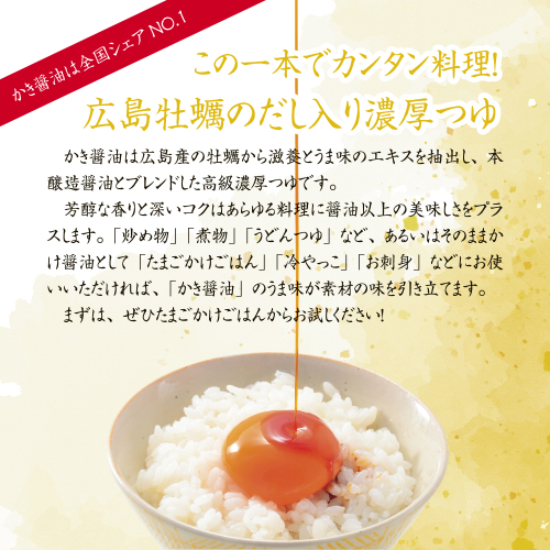 「かき醤油」は広島のカキから滋養とうまみエキスを抽出し、本醸造醤油とブレンドした高級濃厚つゆです。