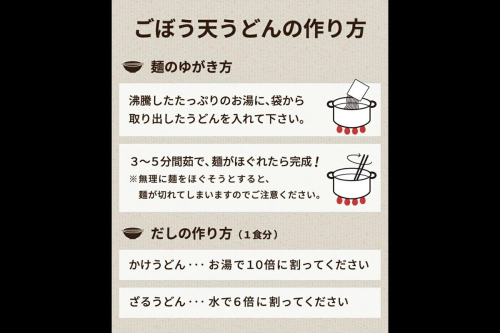 - うどん麺(半生麺:120g×6袋)、あごだしスープ(10g×6袋)、ごぼう天(40g×2袋)