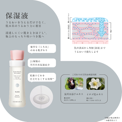 与えるだけではなく、肌本来のうるおう力にも着目。浸透*1を邪魔する角層の脂質までも柔らかくときほぐし、成分を取り込みやすい肌に整える土台ケア*2まで叶います。天然由来の保湿成分がすっと溶けるようにくまなくなじみ、もっちり上質な吸いつき肌へ。