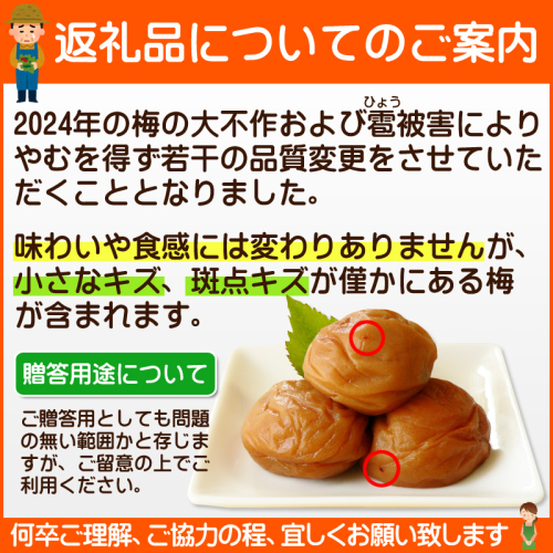 2025年の梅の大不作および雹被害により、小さなキズ、斑点キズが多少ある梅が含まれております。味わいや食感はほぼ変わりありません。何卒ご理解、ご協力のほどよろしくお願い申し上げます。