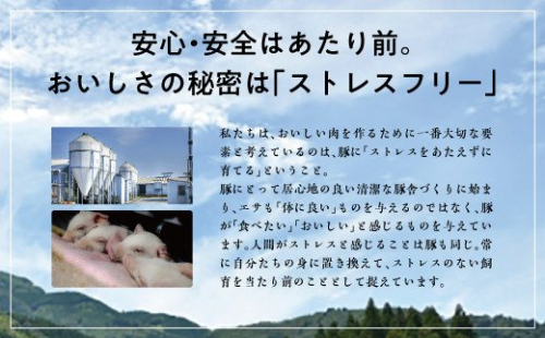 豚にとって居心地の良い清潔な豚舎作りに始まり、エサも「体に良い」ものを与えるのではなく、豚がより「食べたい」「おいしい」と感じるものを与えています。人間がストレスと感じることは豚も同じであり、常に自分たちの身に置き換えて、ストレスのない飼育を当たり前のこととして育てた豚です。