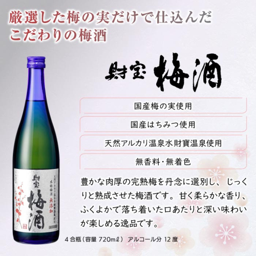 厳選した国産梅の実だけで仕込んだこだわりの梅酒です。 天然アルカリ温泉水 財寶温泉 使用のまろやかでふくよかな味わいが特徴です。 ストレート・ロック・炭酸割り・水割りなど、色々な飲み方ができるのも楽しみのひとつで、女性に大人気の梅酒です。 ※二十歳未満の者の飲酒ならびに飲酒運転は法律で禁止されています。お酒は適量を。 妊娠中や授乳期の飲酒は、胎児・乳児の発育に悪影響を与えるおそれがあります。 【提供】株式会社 財宝 【地場産品類型】 2:当該地方団体の区域内において返礼品等の原材料の主要な部分が生産されたものであること。