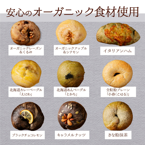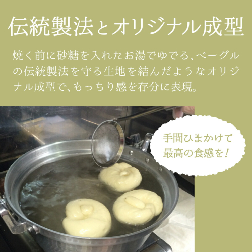 そこに有機食材を多用した具材を合わせて成形し、「砂糖を入れたお湯で数十秒茹でてから焼く」という、ベーグル伝統製法を行うことにより、しっかりとした外側の皮と、しっとりもっちりした内側の、最高食感のベーグルが生まれます。