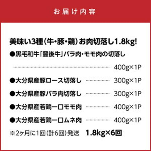 おおいたのブランド黒毛和牛の豊後牛、厳選した大分県産の豚肉・若鶏の3種お肉を便利な切落しにして、2ヶ月毎に1回の隔月で計6回(トータル10.8kg!!)お届けする定期便です。