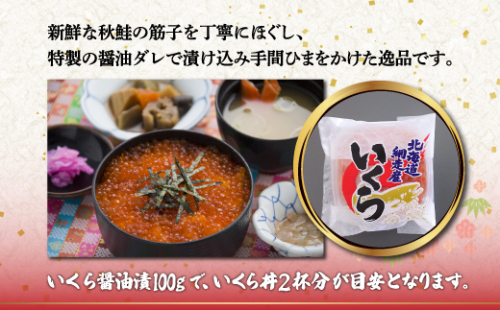 いくら醤油漬100gでいくら丼2杯分が目安となります。 卵が新鮮な内に1粒1粒丁寧にほぐし、特別な調合の醤油ダレで漬け込みました。 十分にタレを吸い込いこませる等、とても手間ひまをかけた逸品です。 イクラ独特の食感が口の中で感じられ、旨味は口の中いっぱいに広がっていきます。 アツアツのご飯と一緒に食べれば、最高の時間が過ごせると思います。
