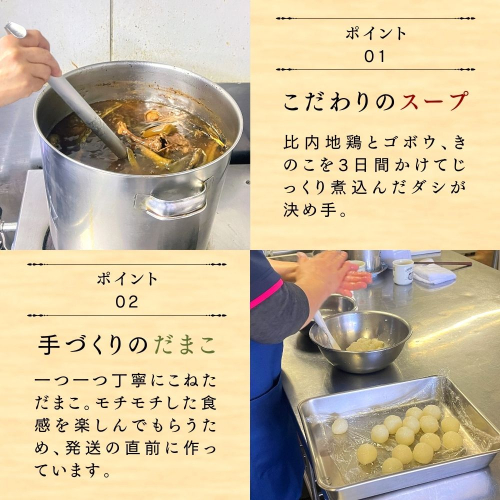 だまこ鍋2人前:だまこ餅20個、比内地鶏約200g、長ねぎ、せり、舞茸、椎茸、ごぼう(笹がき)、白菜、糸こんにゃく、比内地鶏濃厚だし(※野菜は全てカット済みの物)
