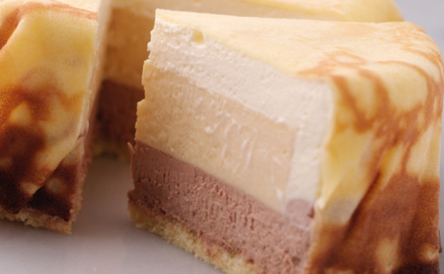 ふらの牛乳プリンをベースに作った美味しいババロアをベルギー産のショコラのふわっとしたムースとホワイトショコラのムースでサンド、上からクレープで包みました。やさし生口あたりが美味しいです。
