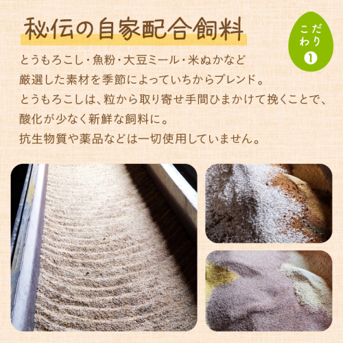 自家配合飼料を食べて育った国産鶏の産んだ玉子です。 飼料はとうもろこしを中心に、魚粉、大豆ミール、米ヌカなどで配合。 抗生物質、薬品等は一切使用しておりません。安心してお召し上がりください。 【地場産品基準】 1号:市内の事業者が市内で飼育している鶏から採った玉子であるため