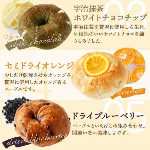 宇治抹茶黒豆、チョコ、セミドライオレンジ、ドライブルーベリー、ウインナー、キャラメル、宇治抹茶ホワイトチョコチップなどのほかに、季節の旬の素材を使ったベーグルも入ることがあります。