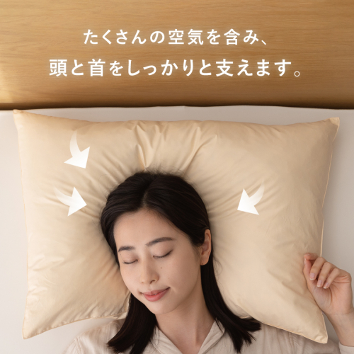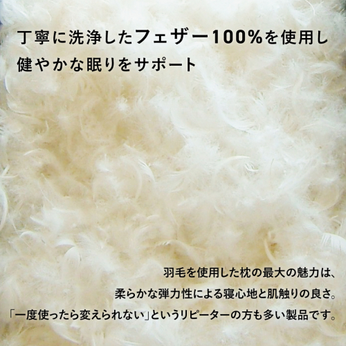 コシのあるフェザー(羽根)のみ使用しているため、ダウンのように柔らかすぎることはなく、しっかりした感触で頭・首をサポートします。