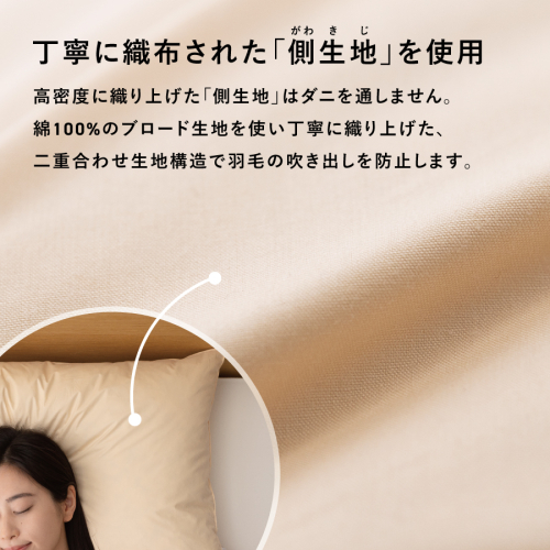 がわ生地は、天然素材・綿100%の平織生地を使用。二重合わせ構造で羽根の吹き出しを防止します。