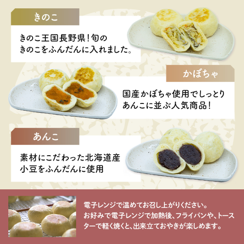【おやき】国産材料にこだわり、ふっくらもちもちした皮にたっぷりと包み込みました。 電子レンジで温めてお召し上がりください。お好みで電子レンジで加熱後、フライパンや、トースターで軽く焼くと、出来立ておやきが楽しめます。