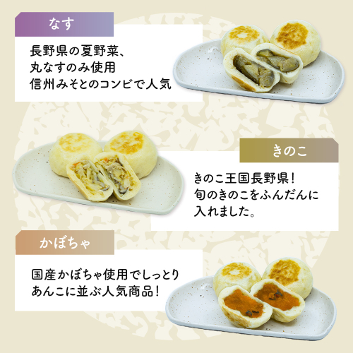 【おやき】国産材料にこだわり、ふっくらもちもちした皮にたっぷりと包み込みました。