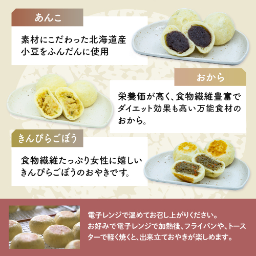 - おやき16個セット(野沢菜2、切干大根2、野菜ミックス2、なす2、きのこ2、かぼちゃ2、あんこ2、うの花(おから)1、きんぴらごぼう1)