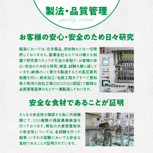 無添加100%の大麦若葉粉末にこだわり、品質改良とおいしさを追求した自慢の味です。
